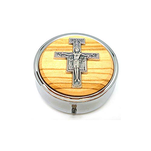 DELL'ARTE Scatola portarosario portapillole Metallo cm 6,2 Finitura nichelata con Inserto in Vero Legno di olivo e placca Metallo Croce San Damiano