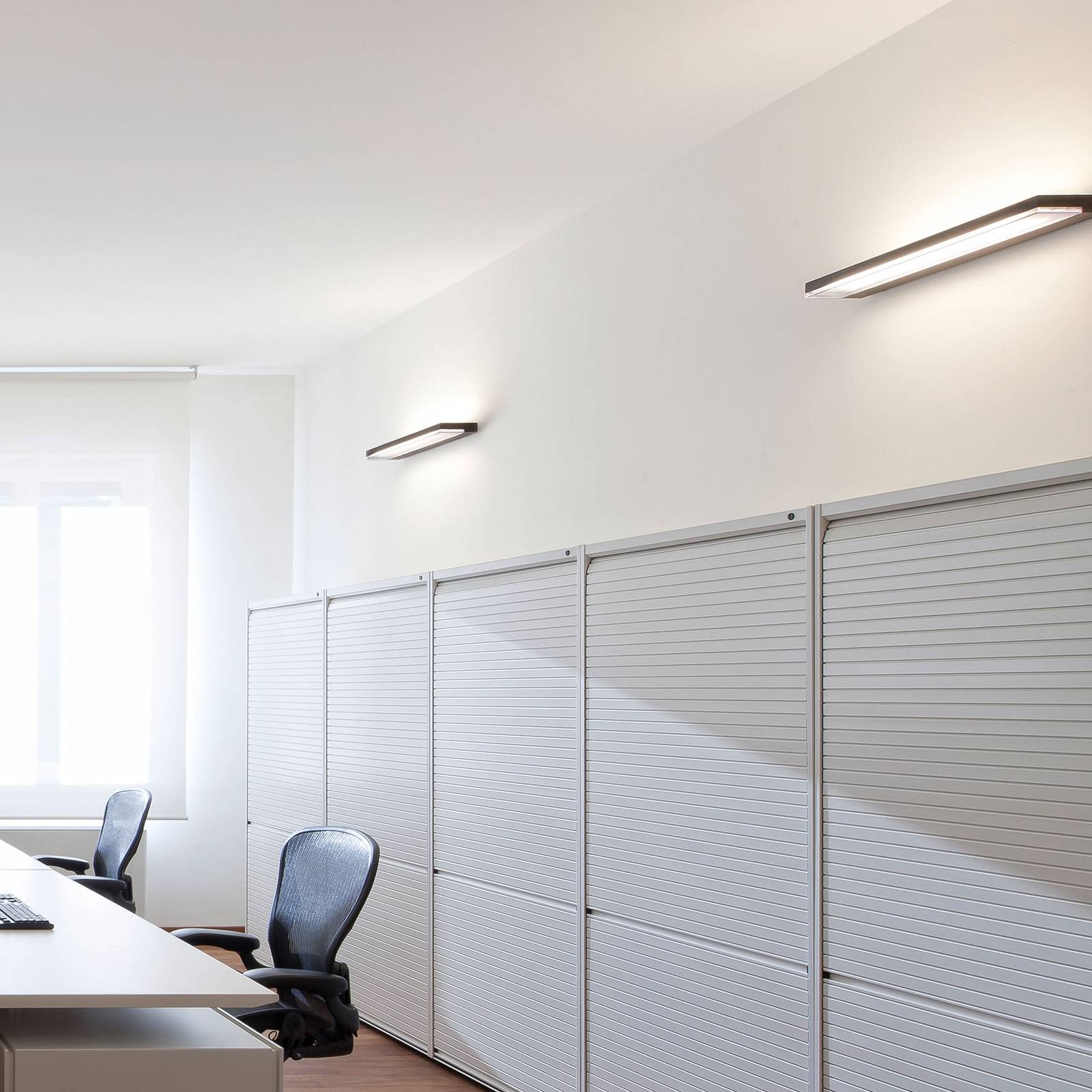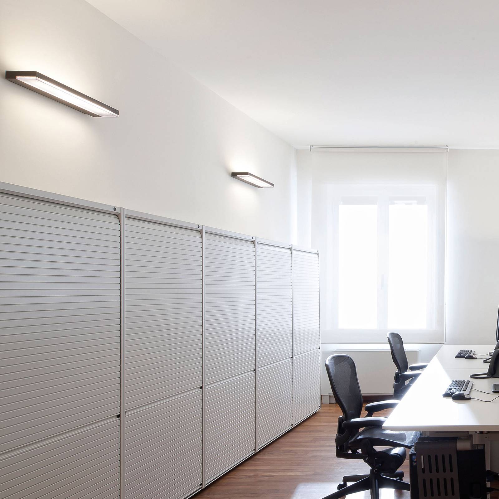 Lampada da parete a LED in stile ufficio L'apparecchio da parete Chocolate combina l'illuminazione indiretta e diretta, che funziona bene in corridoi, sale riunioni o edifici pubblici. Grazie all'ampia superficie di emissione della luce e all'alto rendimento luminoso verso l'alto e verso il basso, Chocolate è destinato anche a stanze alte e spaziose e mette abilmente in scena pareti e scale. L'alloggiamento è in alluminio verniciato e i pannelli diffusori opachi in policarbonato. Questo protegge i LED installati in modo permanente dalla polvere. Il colore bianco universale della luce è spesso usato negli uffici e negli edifici pubblici perché favorisce la concentrazione del lavoro. Il duo di designer tedeschi Klaus Adolph e Wilfried Kramb, meglio conosciuto come a.g.Licht, è sinonimo di design architettonico. In collaborazione con il produttore italiano Artemide, Chocolate è su una solida base per diventare grande a livello internazionale.