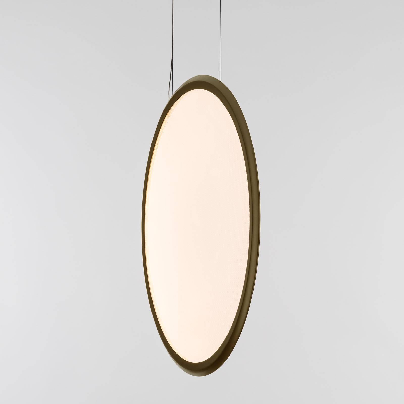 Apparecchio a sospensione a LED Discovery con paralume in bronzo - verticale L'apparecchio a sospensione a LED Discovery mostra la sua piena presenza solo quando è acceso e irradia la luce brillante dei LED installati a sinistra e a destra della paralume allineata verticalmente. L'ampia superficie del diffusore in plastica assicura un'ampia dispersione della luce che, con una resa cromatica di CRI 90, rende i colori dell'ambiente molto naturali. Un'innovativa sorgente luminosa progettata da Ernesto Gismondi, che può essere utilizzata sia nel soggiorno privato che nella hall dell'hotel o nell'ufficio. Nel 1960 Ernesto Gismondi fonda a Pregnana Milanese in Italia la società Artemide, che distribuisce i suoi prodotti in 98 paesi. Molte delle loro lampade di design sono oggi considerate icone del design.