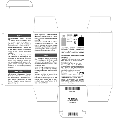 Artemisia comune (Artemisia vulgaris) erba con fiori 300 COMPRESSE da 500 mg (formato da 150 grammi). Prodotto in compresse, pastiglie o tavolette (non sono opercoli, capsule o softgel). 1 compressa contiene 300 mg di Artemisia.