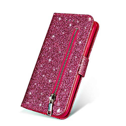 Artfeel Cerniera Portafoglio Custodia Samsung Galaxy S7,Cover Bling Luccichio Pelle Caso con Porta Carte, Flip Chiusura Magnetica Supporto Copertura con Tasca Cinturino-Rosa Rossa