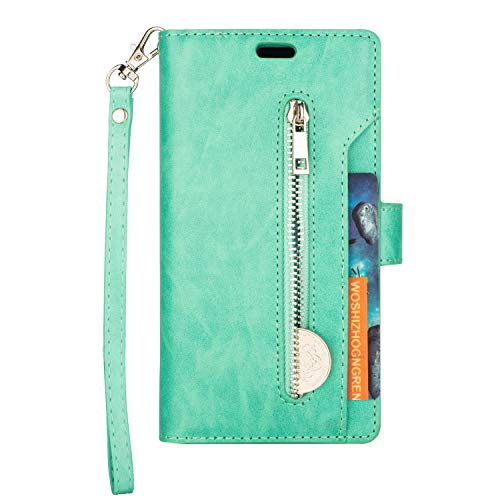 Artfeel Cover Samsung Galaxy A6 Plus 2018,Flip Portafoglio Custodia Verde Menta con 9 Slot per Schede,Premium Pelle Magnetico Supporto Copertura con Cerniera Tasca e Cinturino Caso