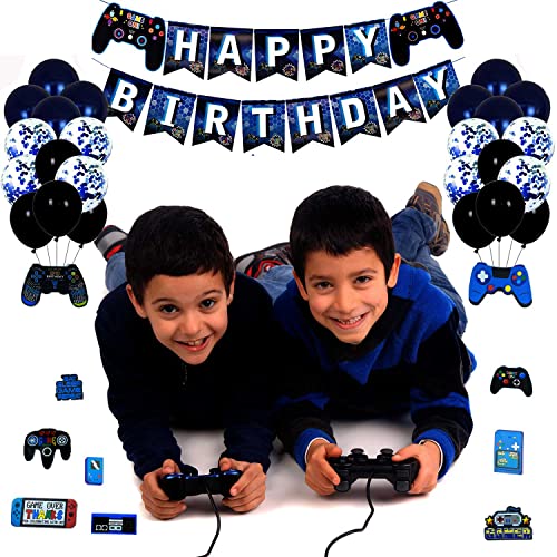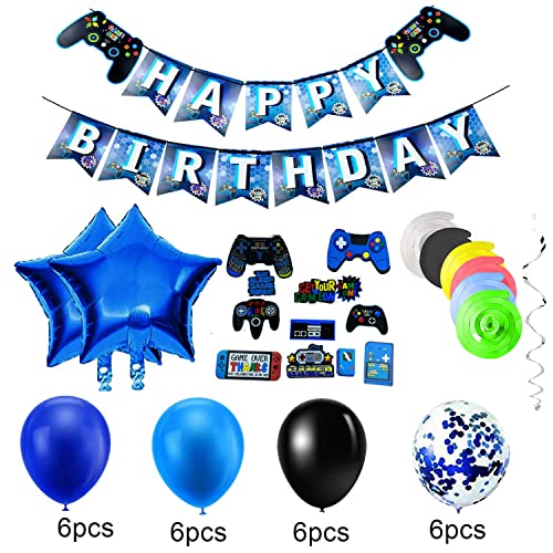 Decorazioni per Feste di Videogiochi: il pacchetto include 1 striscione di buon compleanno, 2 palloncini in alluminio pentagramma da 18 pollici, 30 palloncini in lattice da 12 pollici, 2 palloncini gamepad, 12 vortici sospesi, quantità sufficiente per soddisfare le tue esigenze!