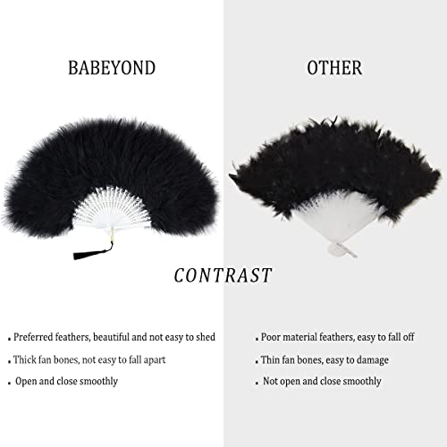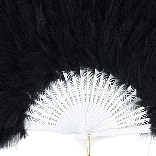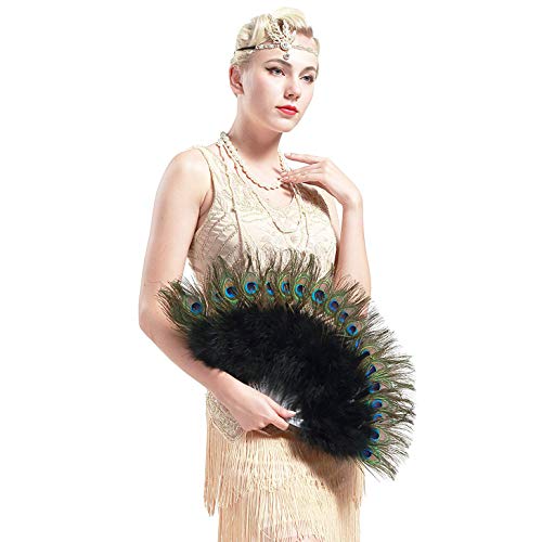 ArtiDeco - Ventaglio da mano anni ‘20, in piume di pavone e marabù, pieghevole, vintage, per feste a tema/costume/decorazione Nero