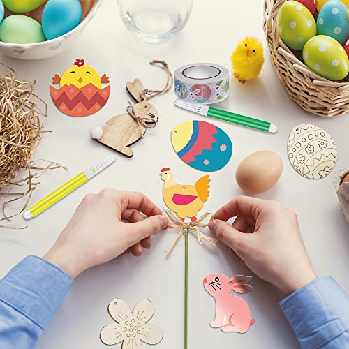 【Kit di Decorazioni Pasqua Ornamenti】- Riceverai 40 pezzi di ornamenti pasquali in legno, 12 pennarelli colorati, corda di canapa e un rotolo di adesivo pasquale. Questi ornamenti appesi a fette di legno non finiti di Pasqua soddisfano tutte le tue esigenze.