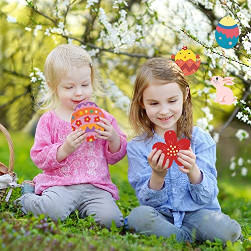 Artigianato in Legno di Pasqua, 53pz Decorazioni Pasqua Ornamenti di Uovo Coniglietto Pulcino Fiore con 12 Pennarello, Pasqua Ornamenti Pendenti in Legno per Lavoretti Bambini, Albero di Pasqua