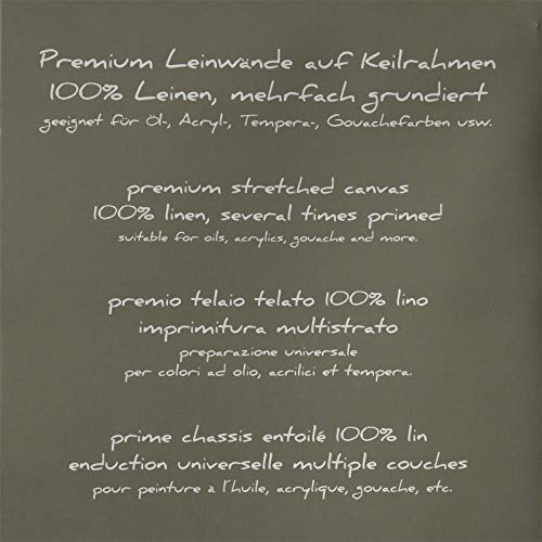 Artikum | Premium Linen sono sinonimo di qualità eccellente secondo gli standard europei. I telai della barella sono rivestiti con tessuto di lino fine in una grammatura di ±430 g/m². Il tessuto di tela è trattato tre volte con un primer pronto per la verniciatura. Il primer universale Gesso è ideale per vernici ad olio e acriliche. Il tessuto di tela è piegato due volte in italiano ed è quindi cucito solo sul retro, in modo che i lati possano essere dipinti senza restrizioni.