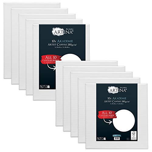 Artina Set da 10 Tele per Pittura 5x 30x40 cm & 5x 20x20 cm Serie Akademie - 100% Cotone Bianco 280g/m² - Telaio in Legno Certificato FSC - non si deforma