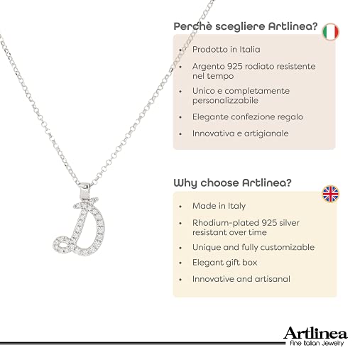 CONTENUTO - A casa riceverai la collana Artlinea in argento 925 personalizzabile con la tua iniziale corsiva piccola di zirconi. La catena è regolabile da 43 a 47 cm, con chiusura a moschettone.Il gioiello arriverà da te confezionato in una delicata ed elegante scatola. Queste collane sono il regalo perfetto per ogni occasione: compleanno, anniversario, festa, matrimonio, vacanza, fidanzamento, San Valentino, Natale, ogni momento è buono per regalare Artlinea