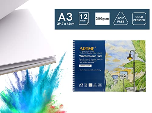 ARTME Blocco/Carta per acquarelli A4 x 12 Fogli / 300g / Doppia Trama/Stampato A Freddo/Cellulosa Blocco Da Disegno Senza Acidi/Qualità Premio Aquarelle E Pittura A Guazzo. (A3-1pz)