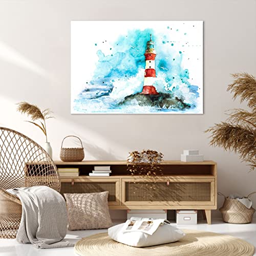 ARTTOR Quadro su tela - Elemento unico - Faro Acqua Illustrazione onda - 100x70cm - Pronto da appendere - Home Decor - Stampe su Tela - Quadri Moderni - completamente incorniciato - AA100x70-2939