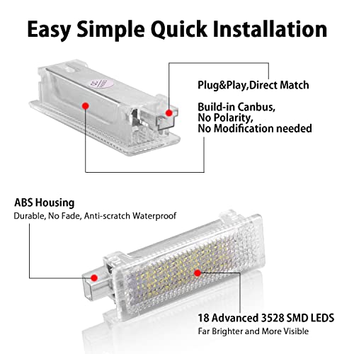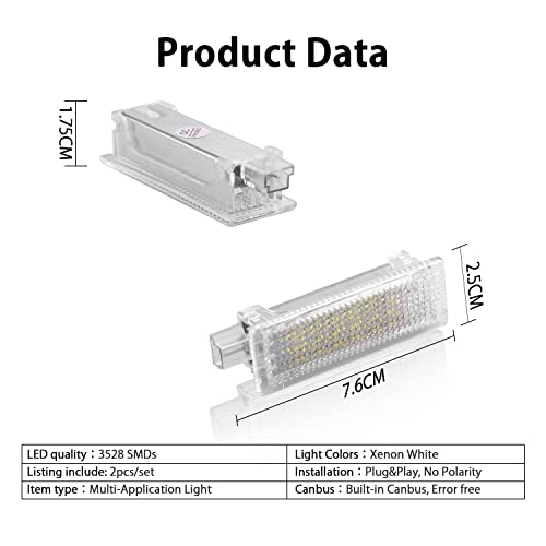 Perfetto per l'aggiornamento delle lampadine alogene di serie, utilizzate come luce sotto la portiera/laterale, luci di cortesia, lampadina del vano piedi, lampada del bagagliaio, luce del bagagliaio, luce del vano portaoggetti ecc.