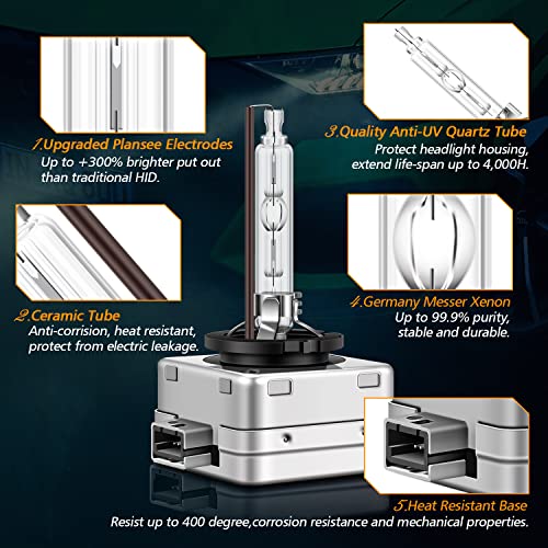 【Super qualità e artigianato】 Fino al 99,9% di purezza allo xeno, prestazioni di illuminazione più stabili e durevoli. Resistente all'olio, al calore e all'usura grazie ai fili e ai materiali di buona qualità, la tecnologia di tenuta impermeabile riduce la possibilità di perdite di pioggia e si verifica un cortocircuito, proteggi la tua cassaforte.