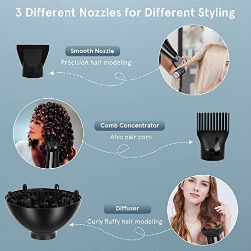 3 minuti POTENTE e asciugatura rapida : Con motore CA professionale, potente motore a coppia elevata, rispetto all'asciugacapelli tradizionale, la velocità è del 60% più veloce, è stato in grado di asciugare i capelli delicatamente e velocemente con basso rumore