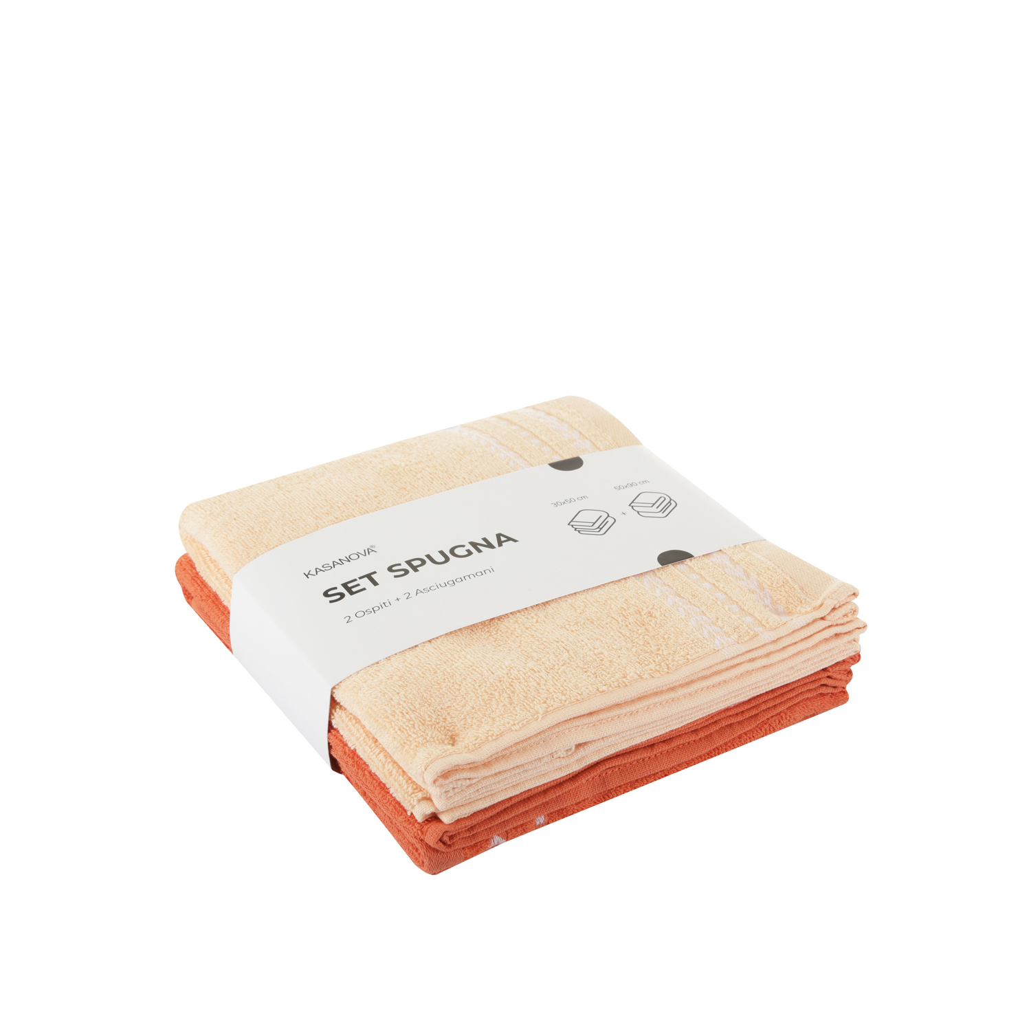 Aggiungi una nota di colore e un tocco di morbidezza all'arredo con questo set tessile bagno coordinato. Le sfumature arancioni in due tonalità staranno benissimo nel tuo bagno con il grazioso decoro sul bordo che caratterizza asciugamano ospite e viso. Il set in 100% cotone con lavorazione Jacquard è composto da 2 coppie di asciugamani: quello ospite ha dimensione 50x30 cm, quello viso ha dimensione 90x50 cm. Grammatura: 400 gsm. Lavabili in lavatrice con ciclo a 40°.