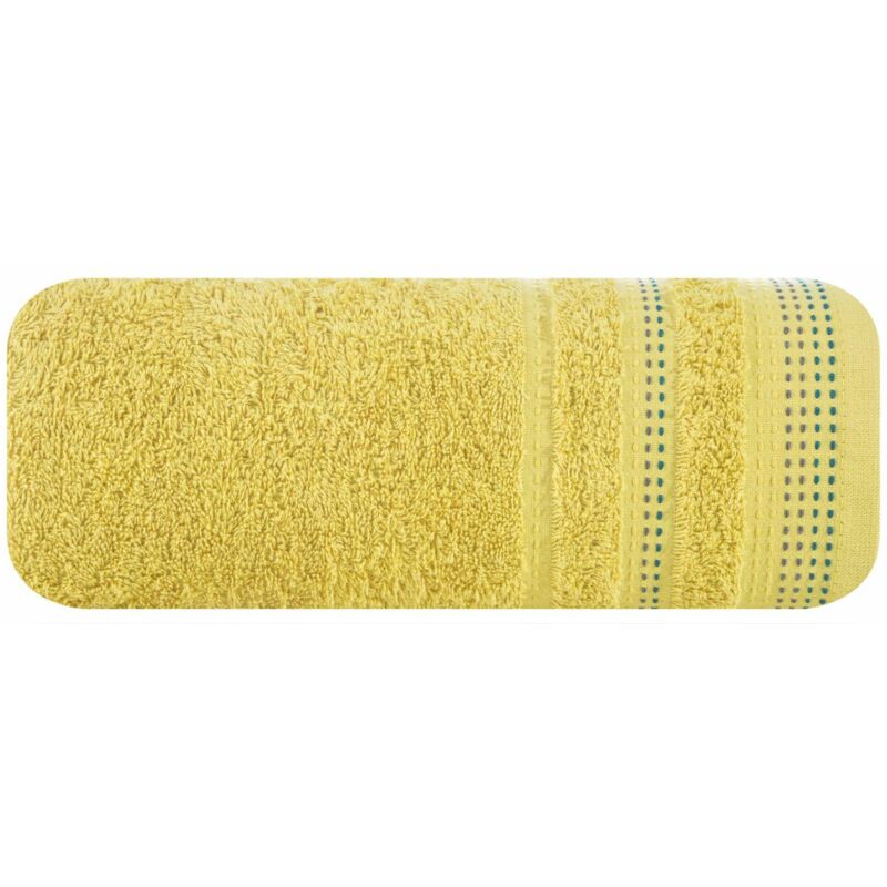 Un asciugamano in tinta unita realizzato in morbido e assorbente tessuto di cotone con armatura a spugna, decorato con un colorato bordo stile imbastitura. Facile da lavare, non tinge. larghezza: 70 cm, lunghezza: 140 cm, colore: senape, peso: 500 g/m², composizione: 100% cotone