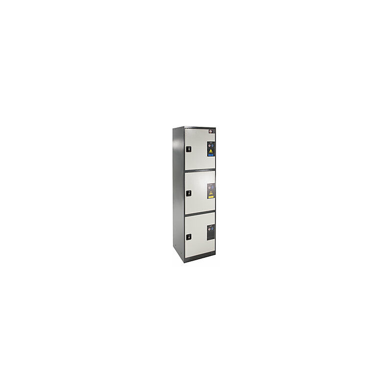 Armadio per sostanze chimiche MULTIRISK, 1 x 1 ripiano, 1 vasca di raccolta, 2 x 2 cassetti, alt. x largh. x prof. 1950 x 540 x 520 mm, 3 scomparti. Fornitura = montato. Altezza = 1950 mm. Larghezza = 540 mm. Profondità = 520 mm. Materiale = lamiera d'acciaio. Colore corpo = grigio antracite RAL 7016. Colore porta = bianco puro RAL 9010. Numero ante = 3 pz. Tipo di porta = porte a 2 pareti. Portata per ripiano = 50 kg. Numero ripiani = 1 pz. Superficie = verniciatura a polvere. Capacità dei ripiani a vasca = 15 l. Numero di vasche di raccolta = 5 pz. L'armadio ha tre scomparti separati, apribili separatamente, con serratura. Per il magazzinaggio a norma di legge e differenziato di diverse sostanze chimiche. Sistema di ventilazione per ogni ripiano. Predisposti per il collegamento a un sistema di estrazione a cura del cliente. Robusta struttura in lamiera d'acciaio con ante a parete doppia. Struttura verniciata a polvere. Corpo in grigio antracite RAL 7016, ante bianco puro RAL 9010.