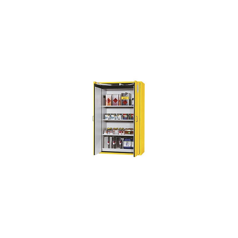 Armadio antincendio tipo 90 per sostanze pericolose, a 2 ante, alt. x largh. x prof. esterne 1968 x 1200 x 615 mm, giallo, verniciato a polvere. Fornitura = montato. Resistenza alle fiamme = 90 minuti. Altezza = 1968 mm. Larghezza = 1200 mm. Profondità = 615 mm. Larghezza interna = 1050 mm. Altezza interna = 1740 mm. Profondità interna = 520 mm. Materiale = pannelli ignifughi speciali, lamiera d'acciaio, verniciata a polvere. Classi di pericolosità = per sostanze infiammabili nei luoghi di lavoro in conformità a DIN EN 14470-1 e TRGS 510 (allegato 3). Aerazione = collegamento all'impianto di estrazione aria (NW 75). Colore corpo = giallo oro RAL 1004. Colore porta = giallo oro RAL 1004. Tipo di porta = anta a battente. Versione porta = a 2 ante. Numero ante = 2 pz. Numero ripiani = 3 pz. Portata per ripiano = 75 kg. Passo di regolazione altezza ripiani = 32 mm. Per il magazzinaggio di sostanze infiammabili negli ambienti di lavoro, in conformità a DIN EN 14470-1 e TRGS 510 (allegato
