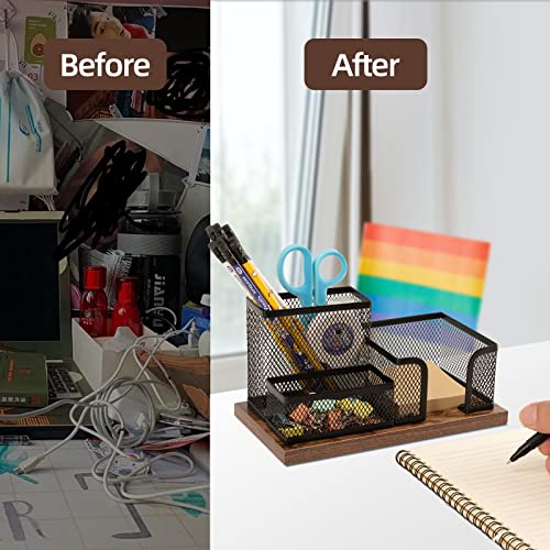 ASIFMTHOT Portapenne in legno anticato e rete, per accessori da scrivania, con porta foglietti adesivi, 3 scomparti (2 pezzi, nero)