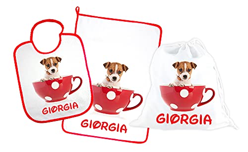 SET ASILO PERSONALIZZATO CON NOME composto da 3 pezzi: bavaglino spugna con elastico cm.27x30, asciugamano cm.40x55 e sacca PERSONALIZZATI Made in Italy - CONSEGNA TEMPESTIVA (TAZZA ROSSO)