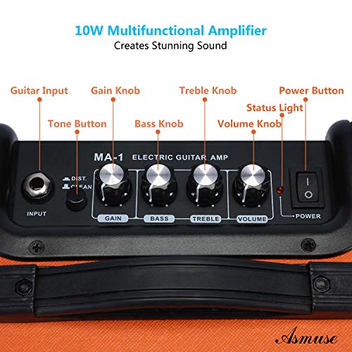 Asmuse Amplificatore Chitarra Elettrica Portatile da 10W Ampli Combo con Effetto di Distorsione 2 Banda EQ Basso Treble e Aux IN Jack (Cavo e Adattatore EU)