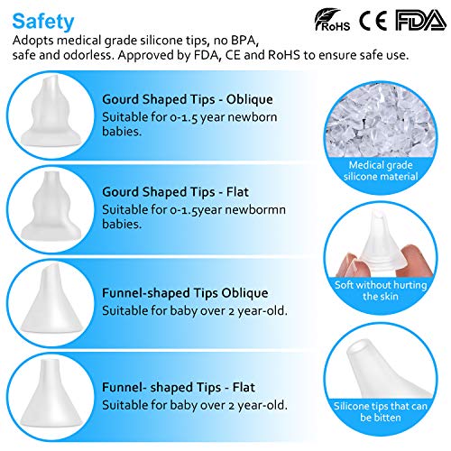 【Sicuro e affidabile】 Testato per uso medico, le punte del naso in silicone morbido possono impedire che il naso del bambino si ferisca e si infesti da batteri. Tutti i materiali del dispositivo e degli accessori sono atossici e sicuri per i bambini e hanno ottenuto la certificazione FDA. Il design curvo a 90 gradi può prevenire efficacemente il contatto accidentale e lesioni al naso del bambino e consentire al bambino di pulire il naso in modo sicuro e igienico.