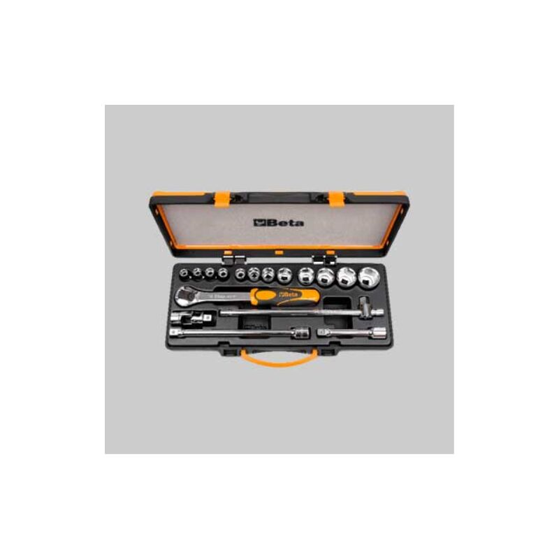 Attacco 1/2. Valigetta in lamiera. Contenuto: 12 chiavi a bussola (mm 10ö32), 1 prolunga mm 125, 1 prolunga mm 255, 1 snodo cardanico, 1 leva a T con quadro scorrevole, 1 cricchetto reversibile. Assortimento bussole art. 920a/c12 beta 17 pezzi BETA Utensileria beta