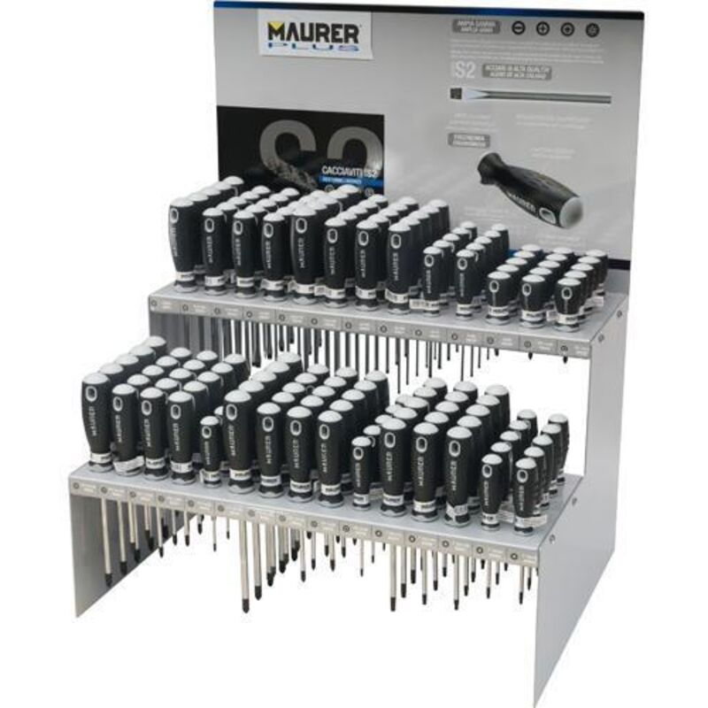 ASSORTIMENTO 140 CACCIAVITI "S2" MAURER PLUS PER ESPOSITORE VUOTO(96455) Articolo: Assortimento 140 pz. Espositore vuoto senza cacciaviti in acciaio verniciato colore grigio - Corredato di cartello serigrafato Maurer 54x35H cm. - Capace di contenere 140 cacciaviti - L'assortimento si compone di 5 pz. per 28 misure: Taglio per elettricisti 3x80;