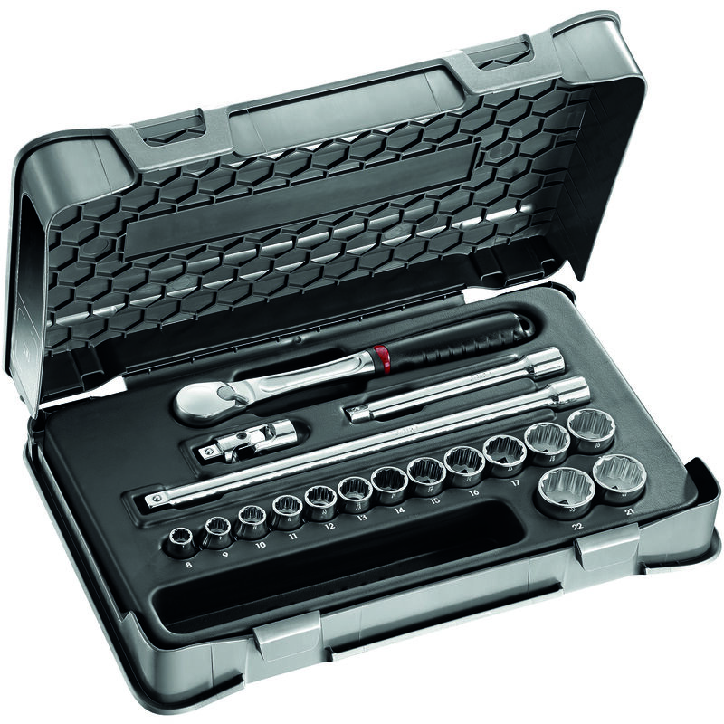 Cassetta in ABS ad alta resistenza con sistema di chiusura rapida Il modulo interno è studiato per essere modulare con i cassetti dei carrelli Codice termoformato vuoto: U05190711Q Composizione Articolo Pezzi Misure 235 3/8 - Chiavi a bussola con bocca poligonale 14 8-9-10-11-12-13-14-15-16-17-18-19-21-22 236 3/8 - Prolunghe 2 125-250 241 3/8 - Snodo cardanico 1 - 237 B 3/8 - Cricchetto reversibile con meccanismo sigillato 1 - 606 M - Cassetta in ABS vuota - taglia M 1