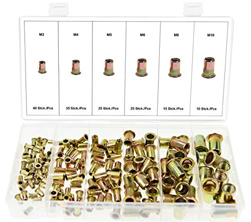Ampia gamma di dadi rivetti in acciaio zincato, 150 pezzi. In 6 dimensioni comuni da M3 a M10 - grazie ai dadi rivettati si ottiene la filettatura nei materiali.