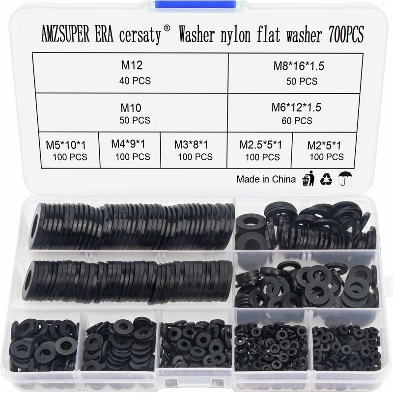 C ◆ Carburante UL94 V-2 ◆ Caratteristico con buona duttilità, resistenza agli urti e assorbimento di energia ◆ Necessità Scatola di plastica: facile identificazione e scatola di immagazzinaggio divisa per mantenere in ordine la rondella di nylon nera. ◆ E la scatola di plastica con un clic, in modo che tu possa assicurarti che la scatola non si allenti automaticamente e cada dalla lavatrice. caratteristica: il pacchetto include: M2 M2.5 M3 M4 M5 M6 M8 M10 M12. rondelle piatte in nylon Quantità;