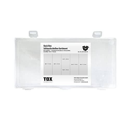 Assortimento di fascette stringitubo TOX in acciaio zincato per il collegamento con raccordi, vite a testa esagonale, 6 misure in scatola di trasporto trasparente, ⌀ 10-40 mm, 26 pezzi, 09490208