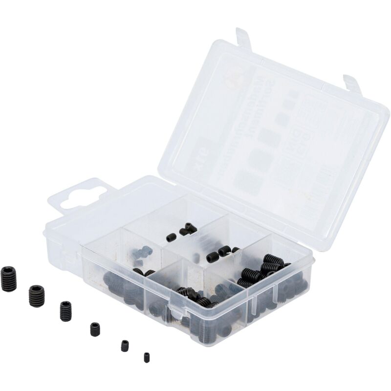 Nella scatola dell'assortimento in acciaio secondo DIN 913, piatti Oggetto della fornitura: 4 grani con filettatura M3 x 5 mm 20 grani con filettatura M4 x 5 mm 15 grani con filettatura M5 x 6 mm 30 grani con filettatura M6 x 10 mm 10 grani con filettatura M8 x 10 mm 12 grani con filettatura M8 x 12 mm Imballaggio adatto per essere appeso alla parete Ja Peso del tessuto 0.136 Dimensioni dell'imballaggio 1 Peso lordo 136 g