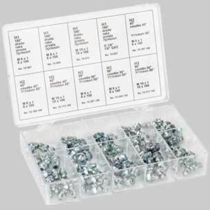 In scatola di plastica composto da: ingrassatori diritti 10 pezzi M6x1, 10 pezzi M8x1, 10 pezzi M10x1, 10 pezzi 1/8 - ingrassatori a 45ø 5 pezzi M6x1, 5 pezzi M8x1, 5 pezzi M10x1 - ingrassatori a 90ø 5 pezzi M6x1, 5 pezzi M8x1, 5 pezzi M10x1. Assortimento ingrassatori 70 pezzi PRESSOL Ingrassatori e accessori