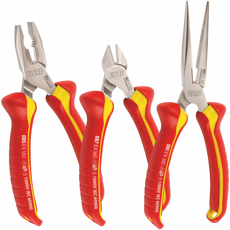 ASSORTIMENTO CON PINZA UNIVERSALE, PINZA A BECCHI MEZZOTONDI DIRITTI E TRONCHESE A TAGLIENTE DIAGONALE ISOLATI 1000 VPROMO• Taglienti ulteriormente temprati ad induzione • Permettono il taglio di filo metallico dolce, di media durezza e duro • Cerniera aperta con articolazione forgiata • Impugnature ergonomiche isolate bimateriali • Asole di aggancio alle estremità per sistemi anticaduta • Esecuzione verniciata trasparente • Ogni pinza è testata secondo la normativa europea EN 60900 per garantire il lavoro in sicurezza • Certificazione IMQ Codice Peso gr Q.tà x conf. U00850121 600 1