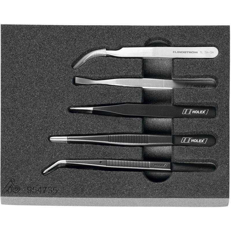 Assortimenti standard di utensili in alloggiamenti in espanso rigido bicolore in PE. La struttura non porosa dell'espanso è impermeabile e resistente agli oli. Strato superiore color antracite, quello inferiore di contrasto color grigio mette in evidenza gli utensili mancanti. Fornitura: Inserto in espanso rigido vuoto n. art. 952001 Dim. 954735: 1 pz. Pinzette a punta HOLEX n. art. 727520 Dim. AMB: 1 pz. Pinzette a punta tronca HOLEX n. art. 727550 Dim. AMB: 1 pz. Pinzette a punta sottile HOLEX piegate n. art. 727600 Dim. AMB: 1 pz. Pinzette a punta larga HOLEX n. art. 727610 Dim. AM: 1 pz. Pinzetta a falcetto HOLEX n. art. 727631 Dim. AM: 1 pz. Dati tecnici Riempimento di un cassetto in G 6×8 Forma in espanso rigido LD45, spessore 30 Tipo di prodotto Inserto in espanso rigido Larghezza in G 6 Profondità in G 8 Larghezza, mm 150 Numero degli utensili 5 Peso, kg 0,145 Profondità, mm 200 Esecuzione con set di utensili