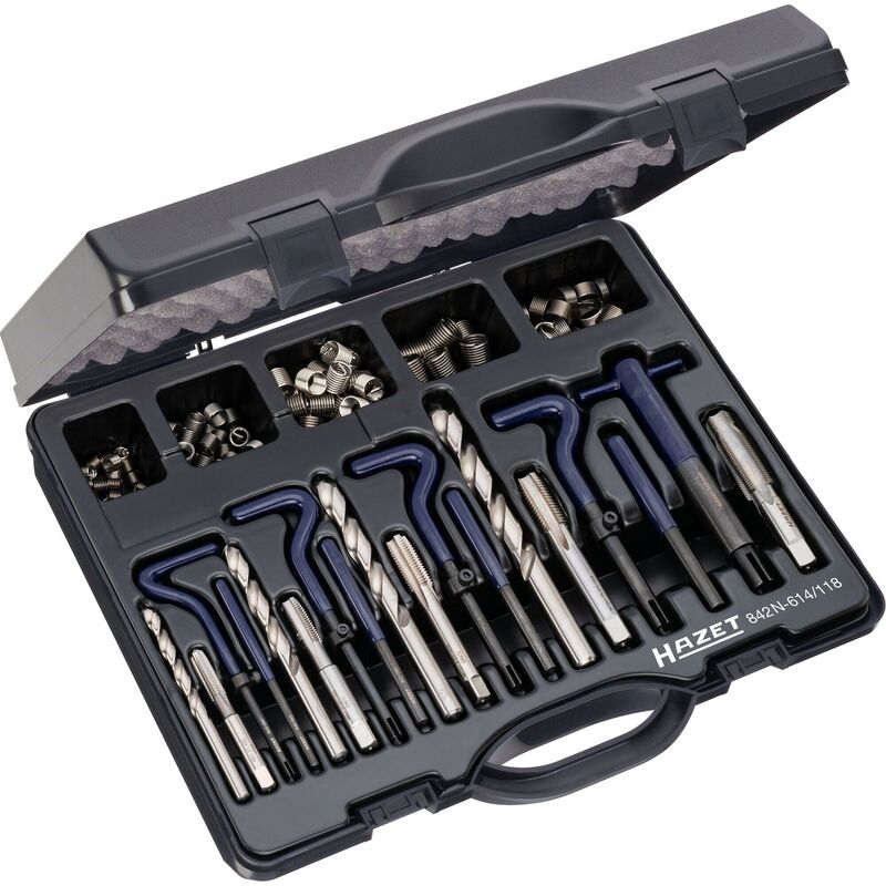 Serie da 118 pezzi ∙ da M6 a M14 M14 specialmente per i filetti delle candele di accensione Contenuto: 25 inserti filettati cad. M6 x 1 x 9 mm M8 x 1,25 x 12 mm M10 x 1,5 x 15,0 mm 10 inserti filettati M12 x 1,75 x 18 mm 5 inserti filettati cad. M14 x 1,25 x 8,4 mm M14 x 1,25 x 12,4 mm M14 x 1,25 x 16,4 mm 4 punte elicoidali, 5 filettatori, 5 utensili di montaggio, 4 utensili troncatori Riparazione di filettature su materiali che presentano bassa resistenza al taglio, ad es. nell'industria automobilistica, ingegneria medica ed elettrica Acciaio inossidabile al cromo-nichel che assicura una perfetta filettatura interna resistente agli effetti della temperatura e della corrosione Cassetta in resina sintetica Peso netto (kg): 2 kg Per la riparazione di filetti danneggiati o usurati Recupero dello scarto Numero utensili: 118 Dimensioni dell'imballaggio 1