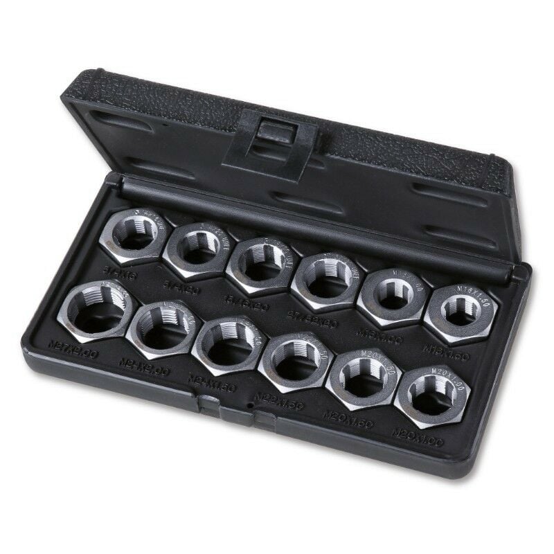 Assortimento per ripristino filetti semiassi - Beta 437K/12 Permette di ripassare e ravvivare il filetto originale Incluse nel kit: • misure metriche: M16x1,0 - M16x1,5 - M20x1,0 - M20x1,5 - M22x1,5 - M24x1,5 - M24x2,0 - M27x2,0 • misure in pollici: 3/4x16 - 3/4x20 - 13/16x20 - 27/32x20 Peso: 840 g Dim,: 220x118x52 mm