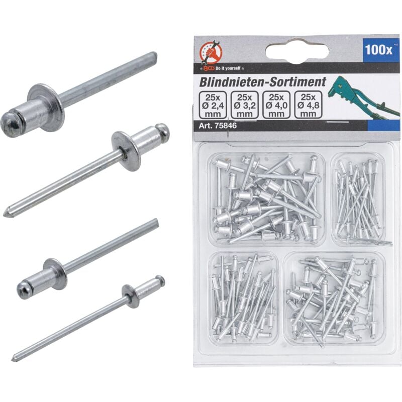 Adatto per rivettatrice BGS 400, 401, 403, 75845 In alluminio con perno in acciaio Oggetto della fornitura: 25 ribattini ciechi Ø 2,4 x 34 mm 25 ribattini ciechi Ø 3,2 x 35 mm 25 ribattini ciechi Ø 4,0 x 36 mm 25 ribattini ciechi Ø 4,8 x 39 mm Imballaggio adatto per essere appeso alla parete Ja Peso del tessuto 0.155 Dimensioni dell'imballaggio 1 Peso lordo 155 g
