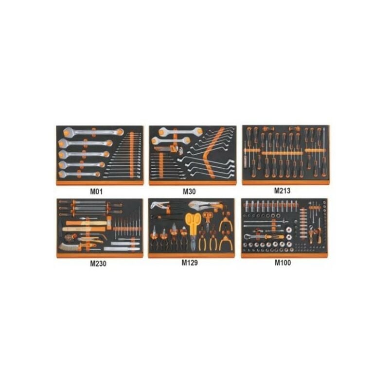 Assortimento di 214 utensili in vassoio morbido in EVA consigliato con: RSC24 - RSC24A - RSC24AXL - C37 - C39 - C39M - C39MD - RSC28 - C59 - RSC55 42NEW chiavi combinate 6-7-8-9-10-11-12-13-14-15-16-17 18-19-20-21-22-24-27-30-32-36 mm 22 55 chiavi a forchetta 6x7-8x9-10x11-12x13-14x15 16x17-18x19-20x22-21x23-24x27-30x32 mm 11 90 chiavi poligonali curve 6x7-8x9-10x11-12x13-14x15 16x17-18x19-20x22-21x23-24x27-30x32 mm 11 96BPC/SC9 chiavi maschio esagonale piegate con estremità sferica 1,5÷10 mm 9 895/1 bussola portainserti 1 895/3 bussola portainserti 1 895/6 bussola portainserti 1 900 chiavi a bussola esagonali 1/4 4-4,5-5-5,5-6-7-8-9-10-11-12-13-14 mm 13 900L chiavi a bussola a mano lunghe bocca esagonale 5-6-7-8-9-10-11-12-13 mm 9 900ME chiavi a bussola maschio esagonale 1/4 3-4-5-6-7 mm 5 900LP chiavi a bussola a giravite per viti con intaglio 0,8x4-1x5,5-1,2x6,5-1,2x8 mm 4 900PH chiavi a bussola a giravite per viti con impronta a croce Phillips® PH1-PH2-PH3-PH4 4 900TX chiavi a