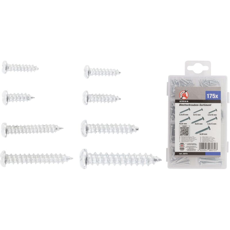 Nella scatola dell'assortimento con incavo a croce Oggetto della fornitura: 50 viti per lamiera 3 x 13 mm 40 viti per lamiera 3,5 x 10 mm 30 viti per lamiera 3,5 x 13 mm 20 viti per lamiera 3,5 x 20 mm 15 viti per lamiera 4 x 20 mm 10 viti per lamiera 4 x 25 mm 10 viti per lamiera 5 x 30 mm