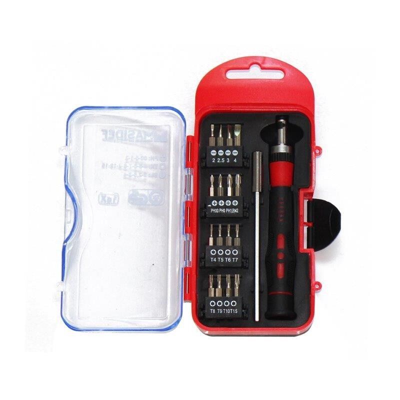 Bit set assortiti con prolunga da 120 mm. 18 pz. 16x inserti/bit in cromo-vanadio: slot 2 2,5 3 4 mm. ph 00 0 1 2 tx 4 5 6 7 8 9 10 15 1x giravite porta inserti a cricchetto con impugnatura ergonomica in bimateriale 1x prolunga da 120 mm. in box plastica appendibile