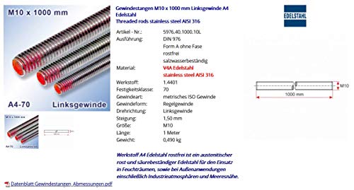 Asta filettata M10 x 1000 mm, filettatura sinistra A4, in acciaio inox, 1 pezzo