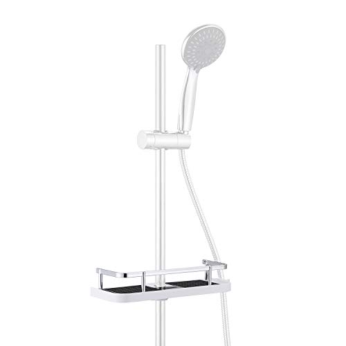 Materiale di alta qualità: portapacchi da doccia realizzato in plastica ABS di alta qualità, ecologico, antiruggine e resistente. Ripiano per asta doccia dotato di piastra inferiore, più pratico. Il piatto doccia sospeso può essere regolato per singola richiesta