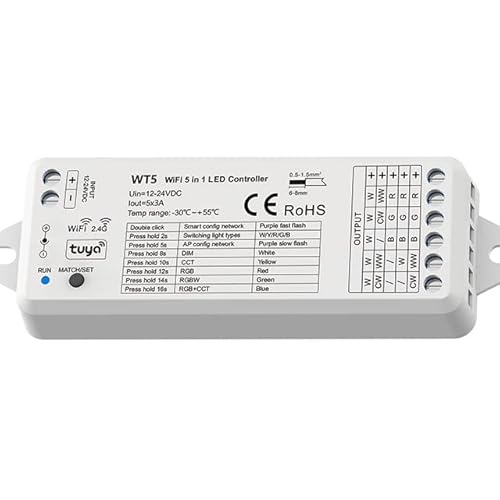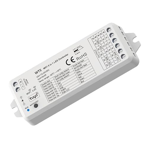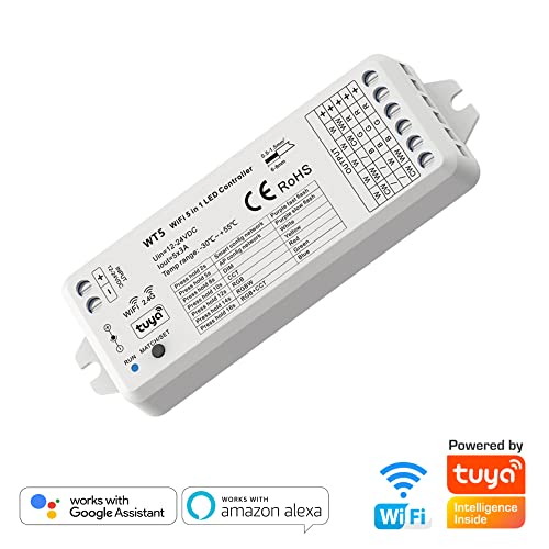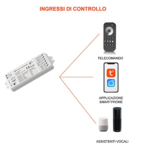 AstraLED - WT5 Controller LED Dimmer Wi-Fi 5 in 1 per Strisce Led con Ingressi App per Smartphone Tuya, Alexa, Google Home, Telecomando RF. Perfetto per Strip Led RGB, RGBW, RGB+CCT, Bianco Dinamico