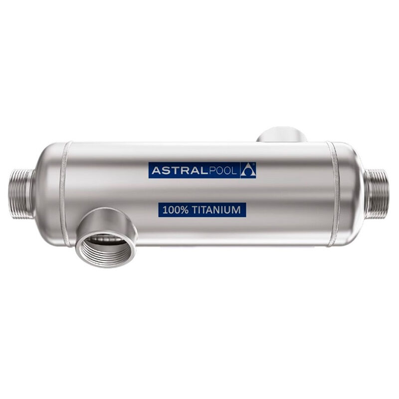 Scambiatore di calore acqua-acqua TIT-105 kW AstralPool Waterheat EVO. Rif. 71610 Lo scambiatore di calore Waterheat EVO per il riscaldamento dell'acqua di piscine e spa, grazie allo scambio di calore tra un circuito primario (hot spot) ed uno secondario (hot spot) ed un circuito secondario (cold spot che vogliamo riscaldare). Corpo in titanio. Bobina in lega di titanio. Pressione di esercizio primaria 10 bar. Pressione di esercizio secondaria 3 bar.