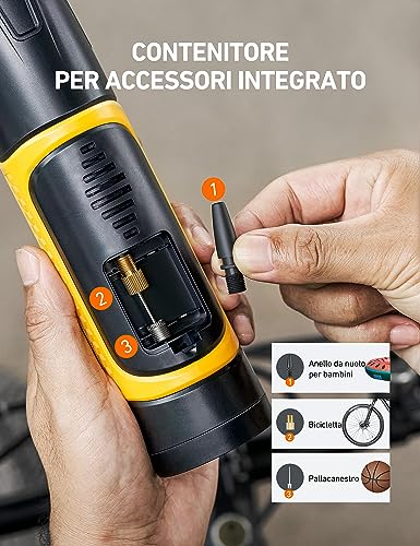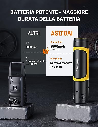 < GONFIATORE WIRELESS & PORTATILE > Grazie al design wireless, il compressore d'aria portatile AstroAI L1 è più comodo da riporre. Ha una batteria da 4500 mAh, che ne aumenta la durata. Inoltre, le sue dimensioni compatte lo rendono facile da trasportare nei tuoi veicoli, nel portabici o nello zaino. E ha una scatola portaoggetti nascosta, in cui è possibile posizionare gli accessori della valvola per evitare perdite.