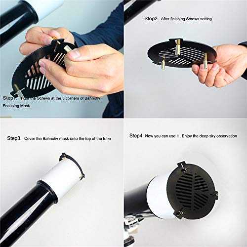 Le maschere afferrano il tubo del telescopio delicatamente ma saldamente con tre pali metallici che hanno maniche in silicone antigraffio per proteggere la superficie del telescopio apprezzata. Ciò impedisce lo slittamento, consentendo alla maschera di rimanere perfettamente centrale. A causa di questo montaggio a 3 montanti, la maschera rimane centrata, mentre si adatta a una gamma più ampia di telescopi.