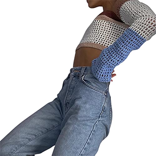 Aststle Donne Scava Fuori Crochet Knit Maglione Crop Top Y2K Color Block Manica Lunga Estate Autunno Maglione Pullover Top Streetwear, L marrone, S