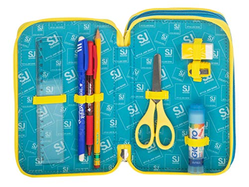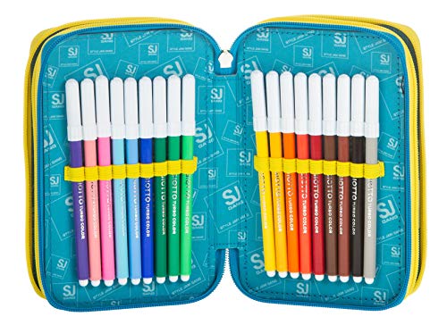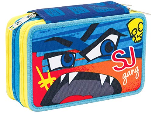 Astuccio 3 Zip, Facce da SJ, Blu, Con materiale scolastico: 18 pennarelli e 18 pastelli Giotto, penna Tratto Cancellik ...